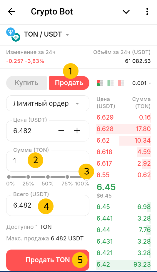 Выбираем "Продать", так как мы хотим обменять TON на USDT.