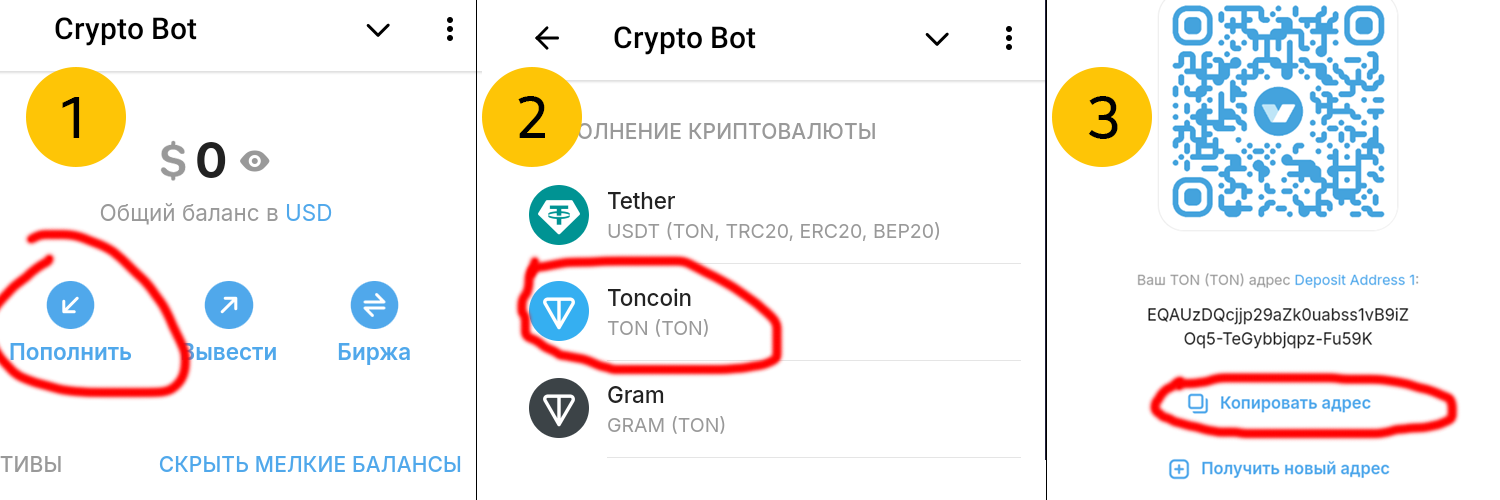 3. Получаем ВАШ адрес тон внутри бота. ( Сюда мы будем отправлять тоны для обмена).