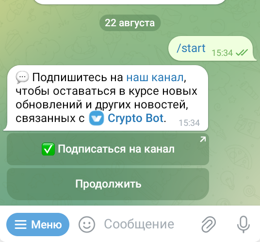 - Бот просит подписаться на канал! Делаем это и нажимаем кнопку продолжить