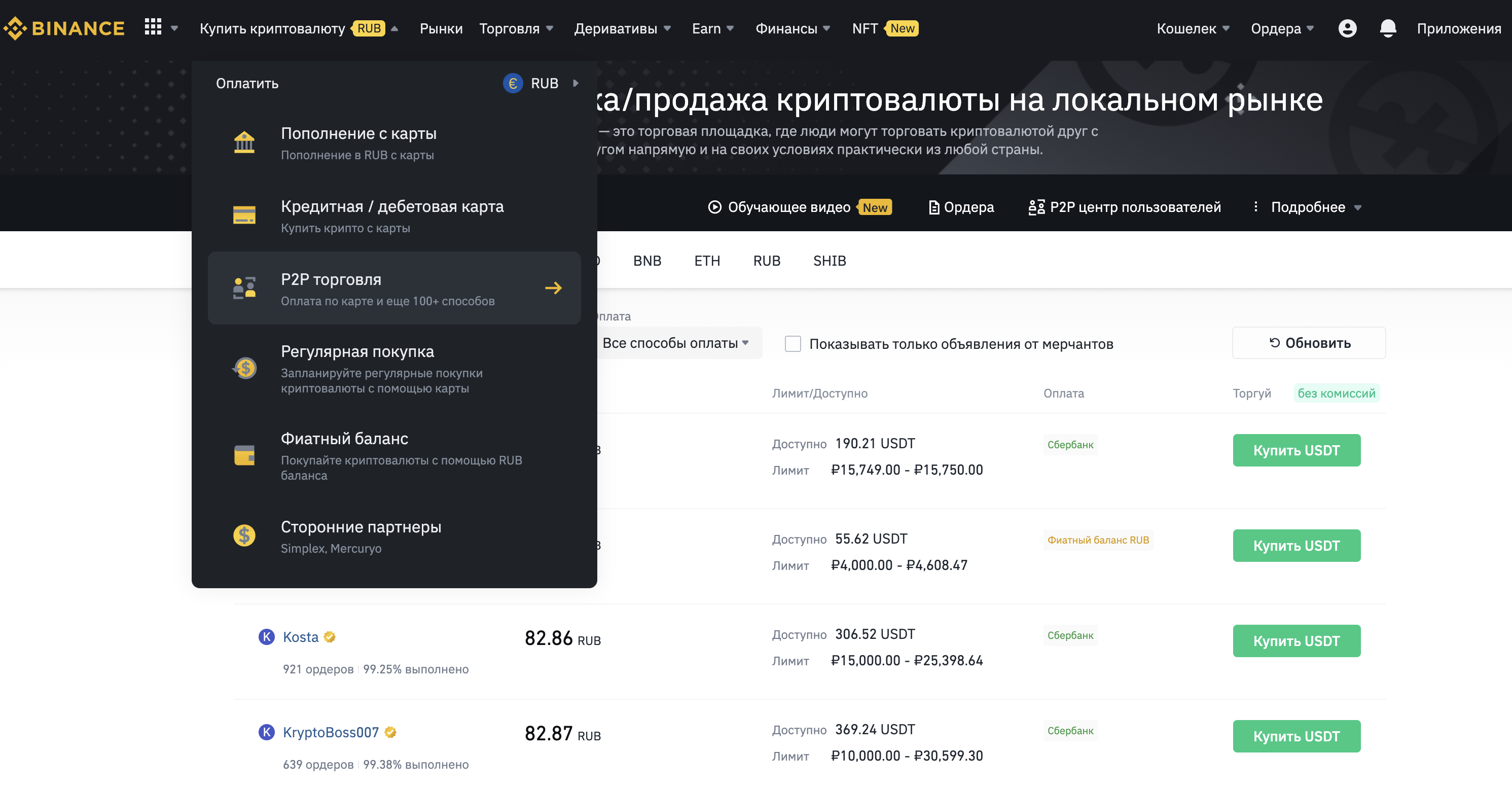 Переходим на вкладку P2P-торговля.