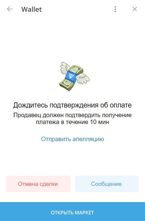 Продавец пойдёт проверить вашу оплату и нажмёт у себя "подтвердить получение". Только после этого вы получите свои деньги в кошелёк @wallet. Пока продавец не подтвердит получение денег - ни он ни вы не получите криптовалюту.