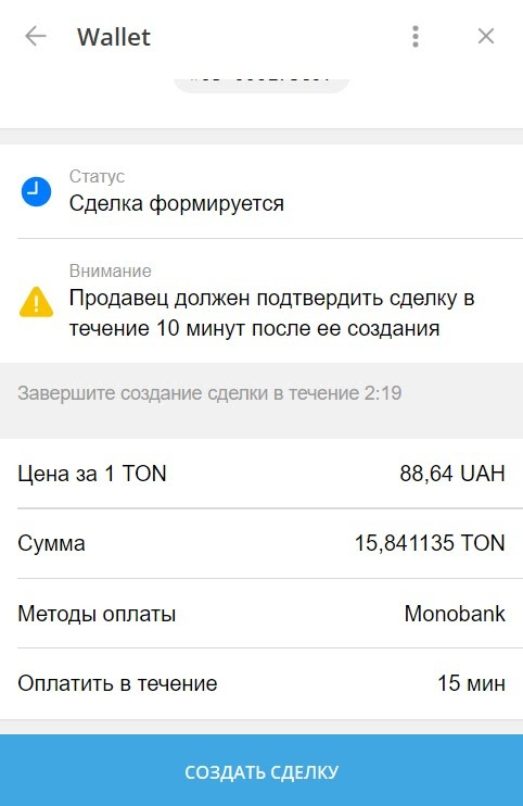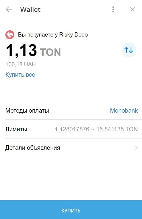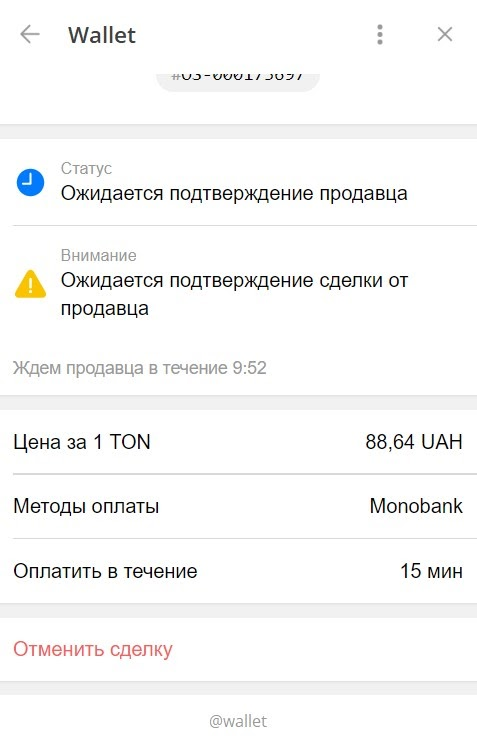 Здесь хочу обратить внимание на такой нюанс: вы должны понимать, когда продавец создаёт объявление о продаже, то его деньги, тот максимальный лимит, который он предоставляет к продаже, блокируется на маркете. То есть если продавец продаёт 15TON, то эти 15TON у него берёт в залог маркет (бот @wallet) чтоб после вашей оплаты перечислить их или часть из них вам, когда вы нажмёте кнопку "подтвердить оплату". Это исключает мошенничество со стороны продавцов.