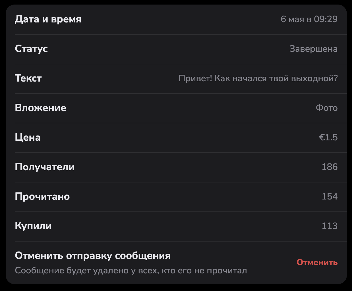 Рассылки мы делали каждый день. Одну с продажей, другую для старта секстинга. Очень хорошо заходили утренние рассылки по выходным. По ним самый высокий процент покупок (это нас очень удивило).