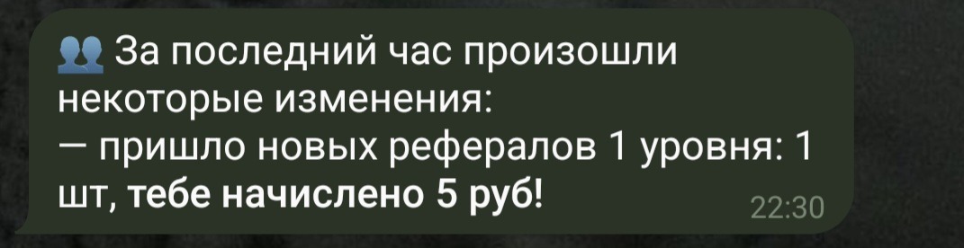 Примерно через час вас уведомит бот о том, сколько новых рефералов к вам пришло и сколько рублей вы с них получили.