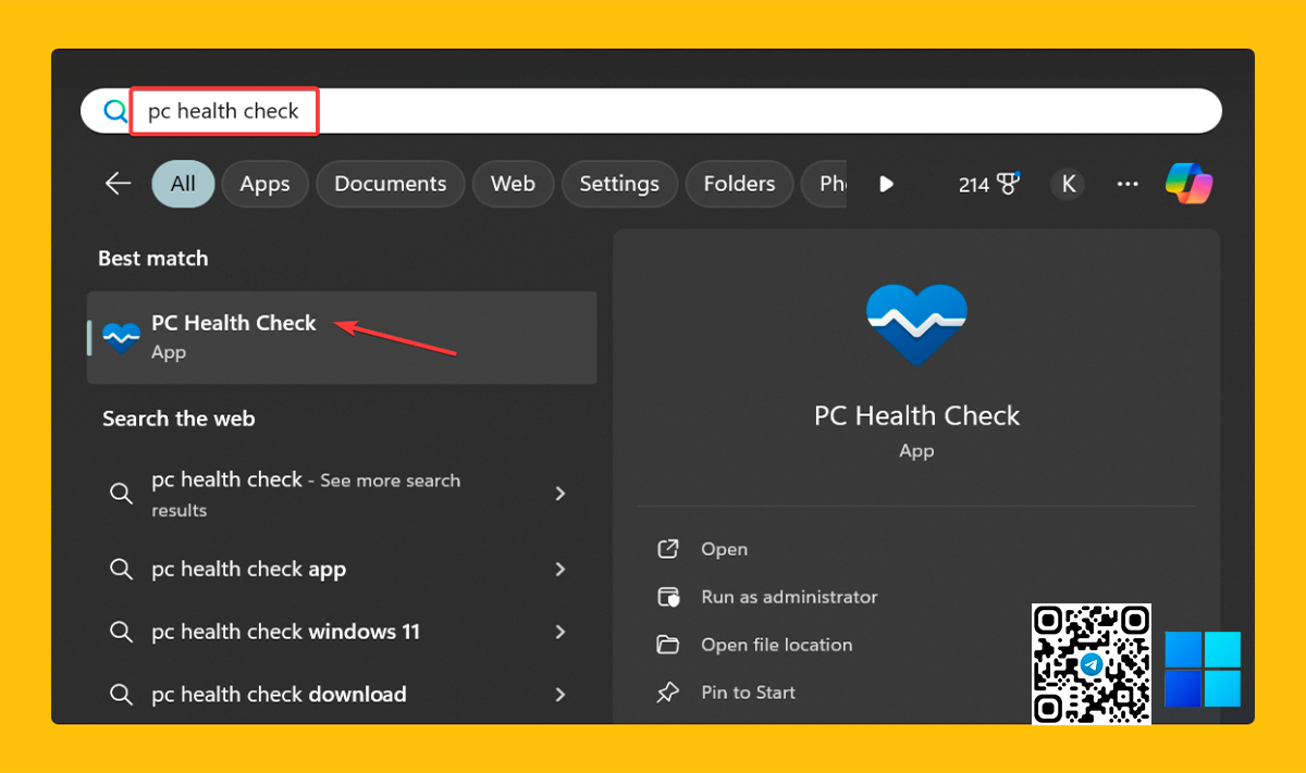 - Через интерфейс приложения PC Health Check Нажмите Windows + S, чтобы открыть Поиск, введите PC Health Check в текстовом поле и нажмите на соответствующий результат.