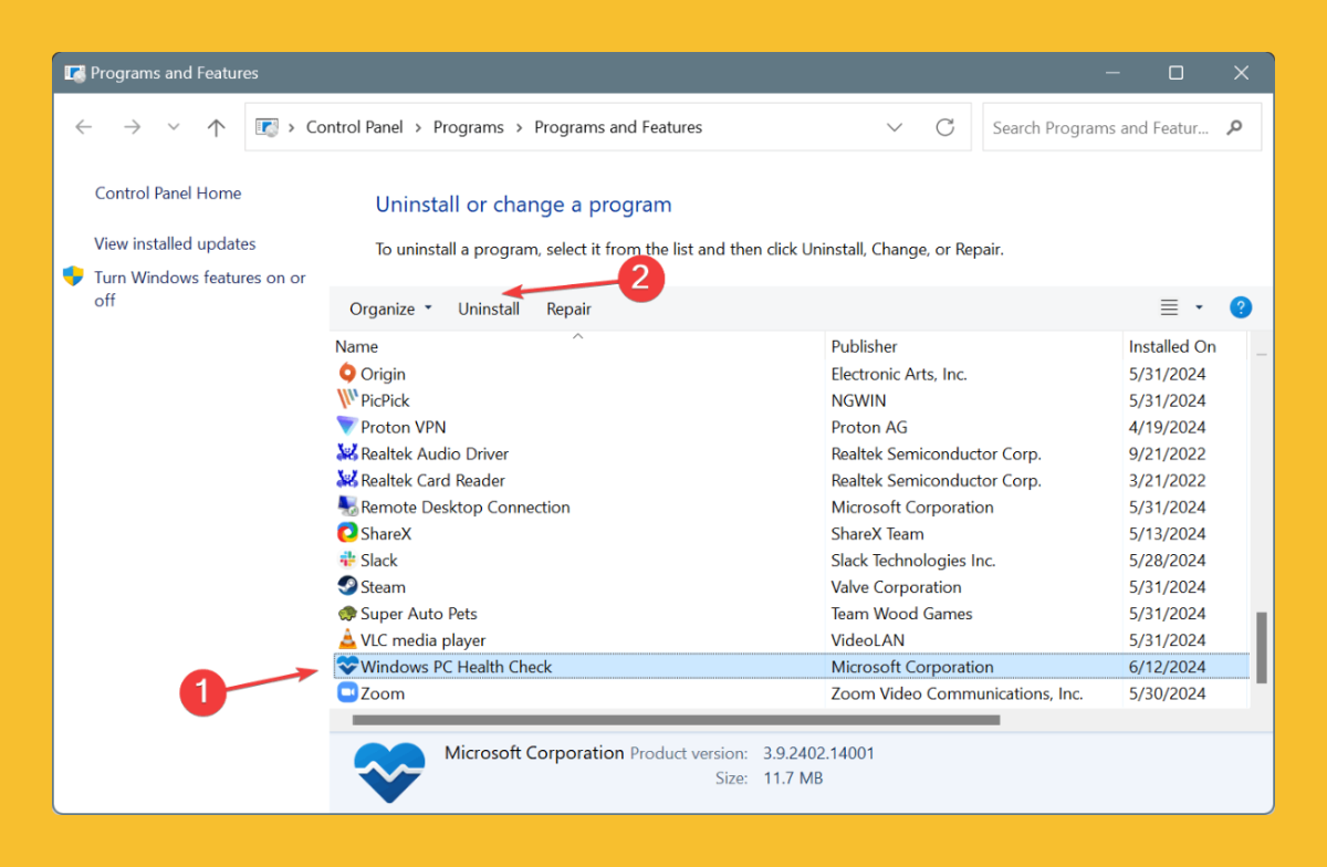Нажмите Windows + R, чтобы открыть "Выполнить", введите appwiz.cpl в текстовом поле и нажмите Enter. Выберите Windows PC Health Check из списка установленных приложений и нажмите "Удалить".