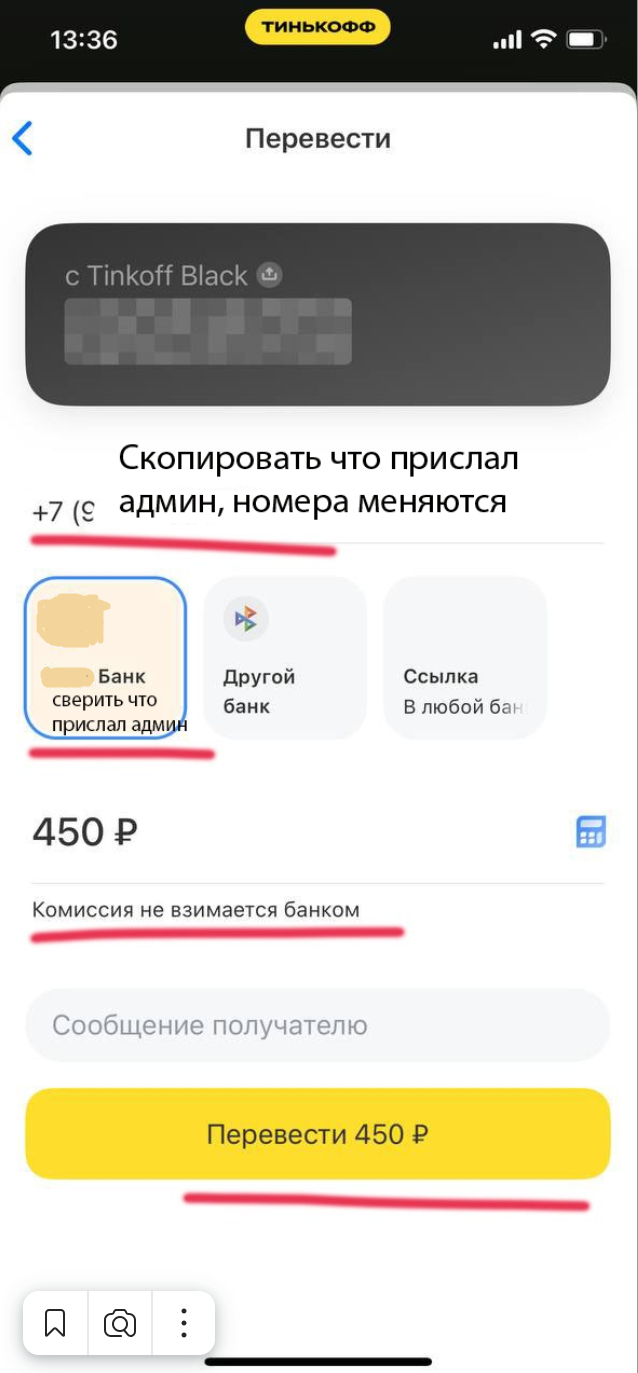 - ❗️ Чтобы оплатить через бота делаем такой же перевод, только переводим точную сумму с копейками какую прислал бот, одним платежом 455,55 руб.