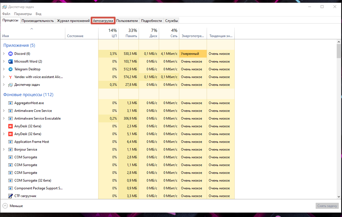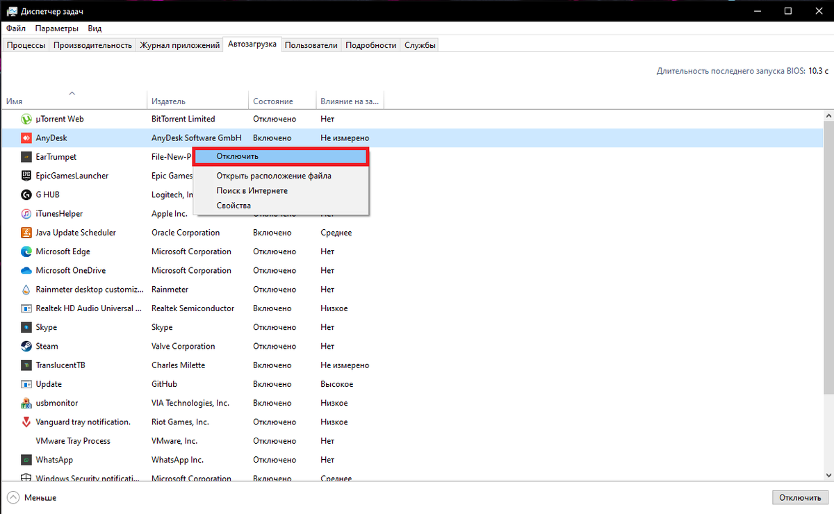 - Отключение автозагрузки: перейдите в «Диспетчер задач» -> «Автозагрузка» и отключите все программы, которые не нужны при запуске системы.