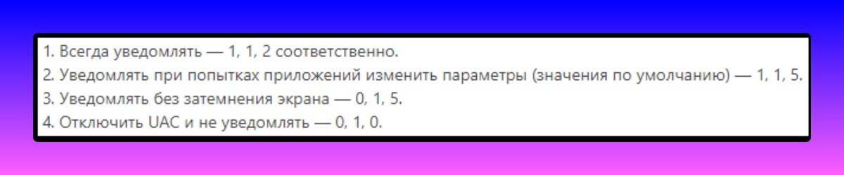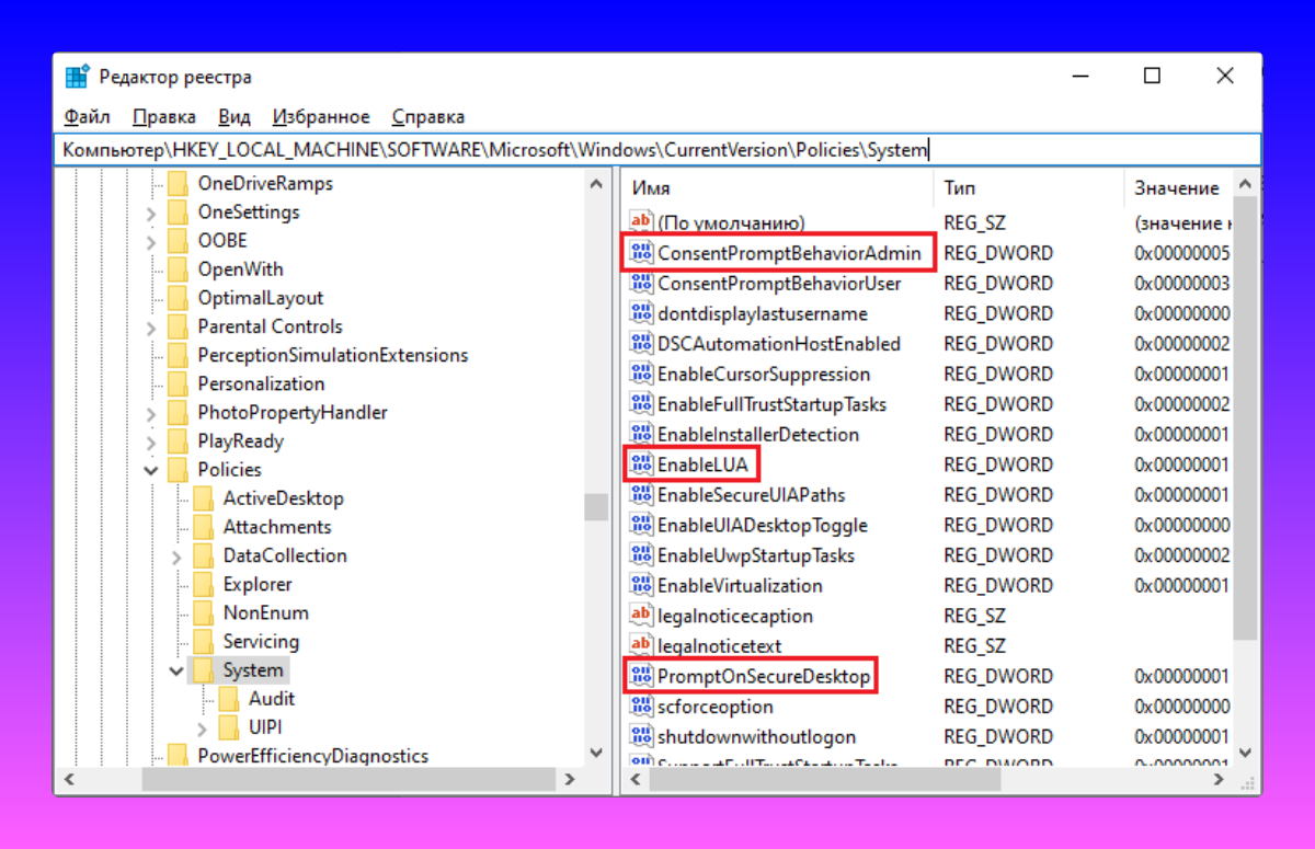 В последней папке нам потребуется внести изменения в несколько параметров: PromptOnSecureDesktop, EnableLUA, ConsentPromptBehaviorAdmin. Их значения стоит выставлять в соответствии с этой схемой.