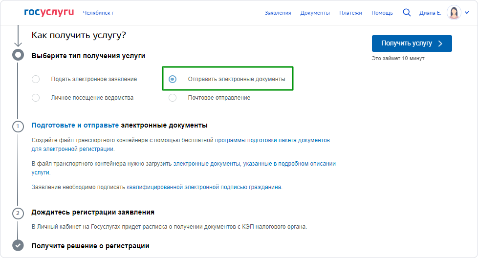 Шаг 3. Выберите тип получения услуги «Отправить электронные документы».