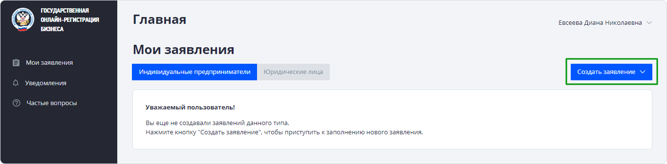 Шаг 8. Создайте заявление: заполните готовую электронную форму и отправьте на рассмотрение. Некоторые параметры система сразу проверит по базе налоговой, и если обнаружит ошибку, то пришлёт уведомление.