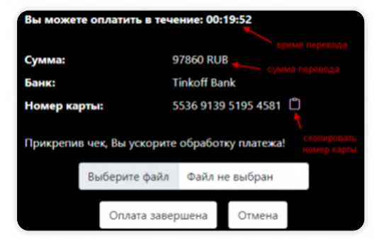Важно! Для перевода отводится ровно 20 минут. Если вы не успеваете произвести перевод за это время, лучше сформируйте другую сделку с новыми реквизитами, предварительно подготовившись к осуществлению перевода .