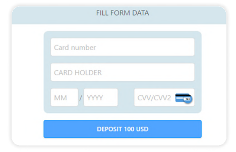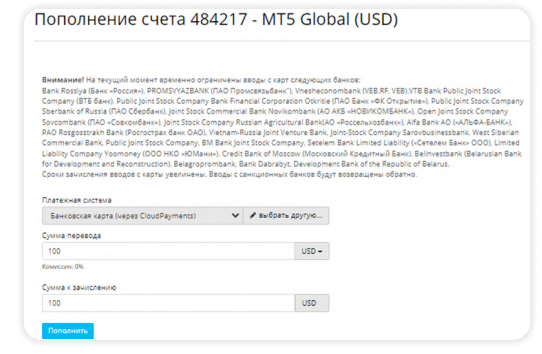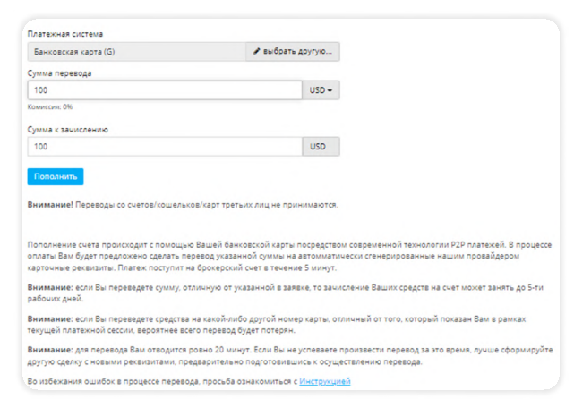 1. Вводим сумму пополнения в долларах. Минимальная сумма пополнения - 100$, максимальная - 4 900$.