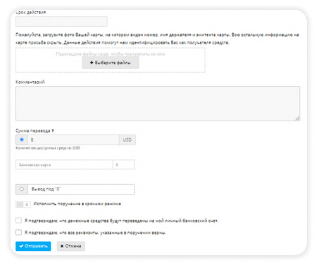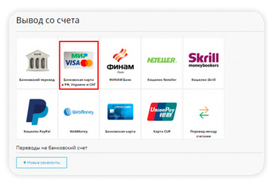 Способ 1. Вывод на карту, открытую в РФ, Украине или в станах СНГ Минимальная сумма вывода: 10 USD/ 10 EUR/ 500 RUB.