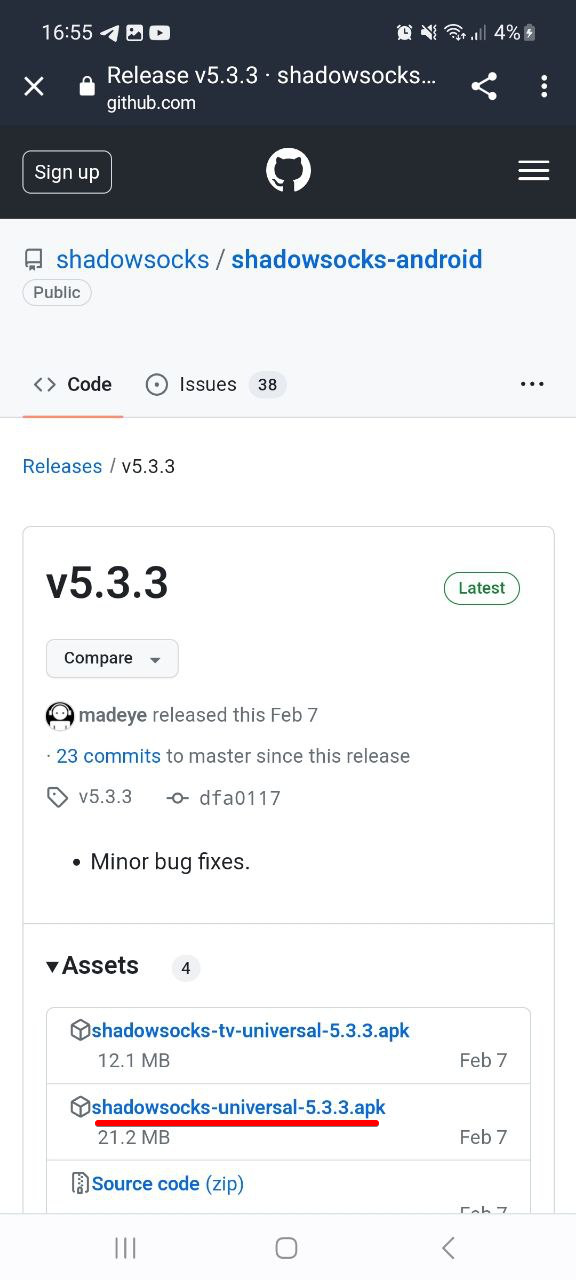 Найдите на странице файл вида: shadowsocks-universal-Х.Y.Z.apk (НЕ shadowsocks-tv-universal-...; без добавления -tv- в имени).