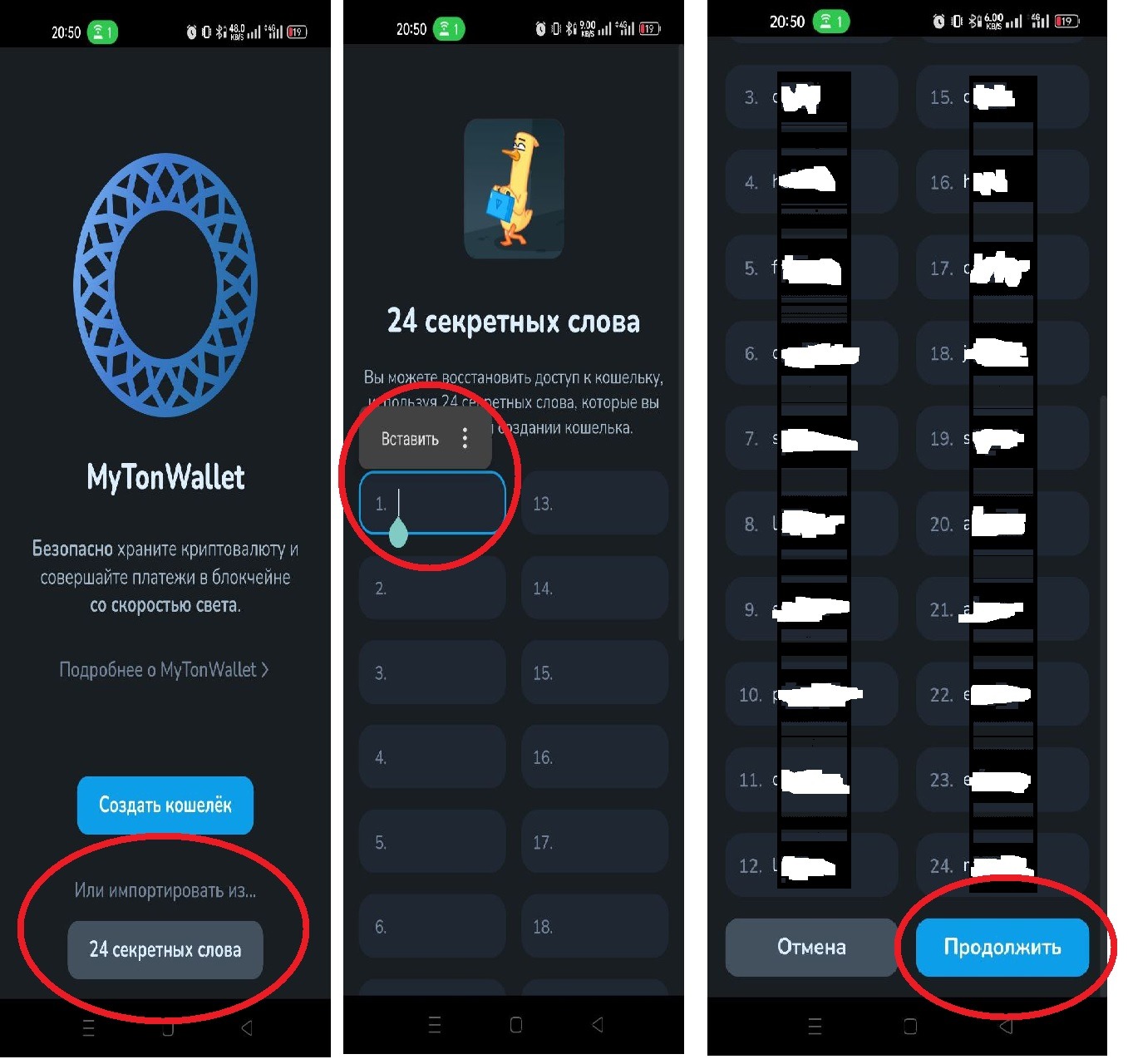 9. Нажимаем на 24 секретных слова ( новый создавать не надо у вас уже есть он в телеграмме)