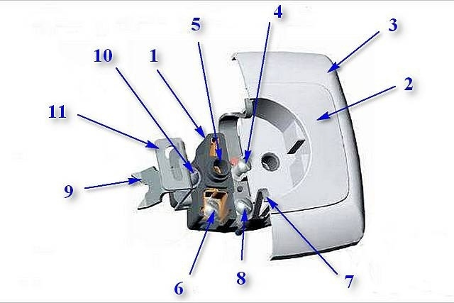 Основную роль выполняет корпус (поз.1), в котором собраны контактные группы и клеммы, а также приспособления для фиксации розетки в гнезде подрозетника или непосредственно на поверхности стены. Корпус изготавливается из диэлектрического материала – чаще всего это пластик, но может быть и керамика. Розетки с керамическими корпусами по стоимости несколько дороже и считаются более качественными. Однако, требуют аккуратного обращения при установке – если розетку случайно уронить или, например, сильно перетянуть винты крепления, то корпус может разломиться, и восстановлению подлежать не будет.