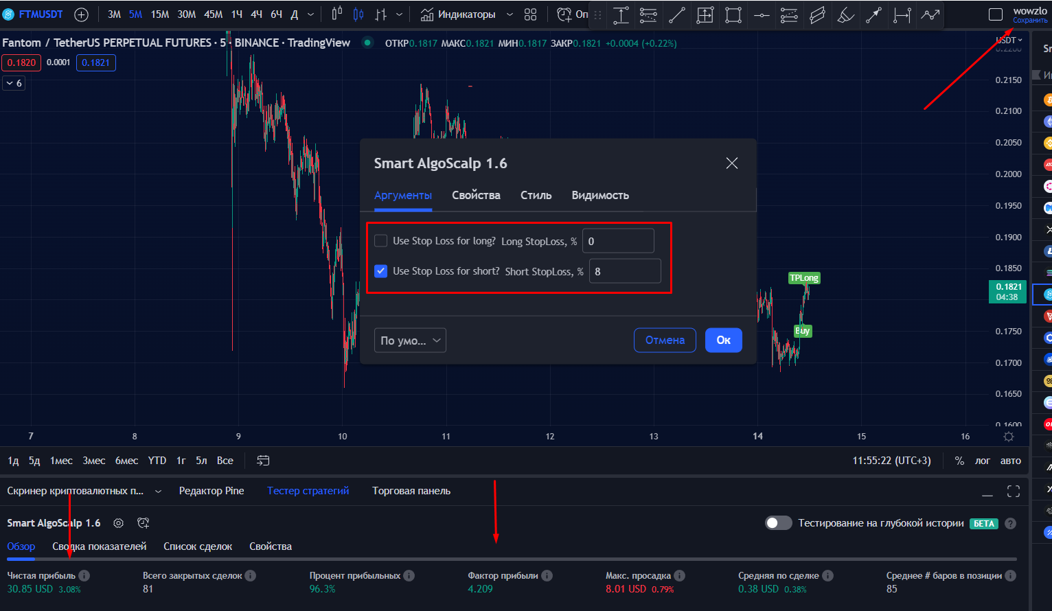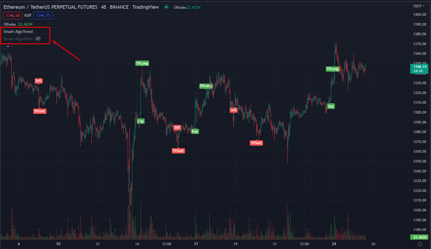Smart Algorithm - это стратегия отлично подходит для авто-торговли. Желательно настроить авто-торговлю через finandy или capico. Это не реклама, а просто рекомендация, что бы вы не пропускали сигналы. Настраиваемые SL.