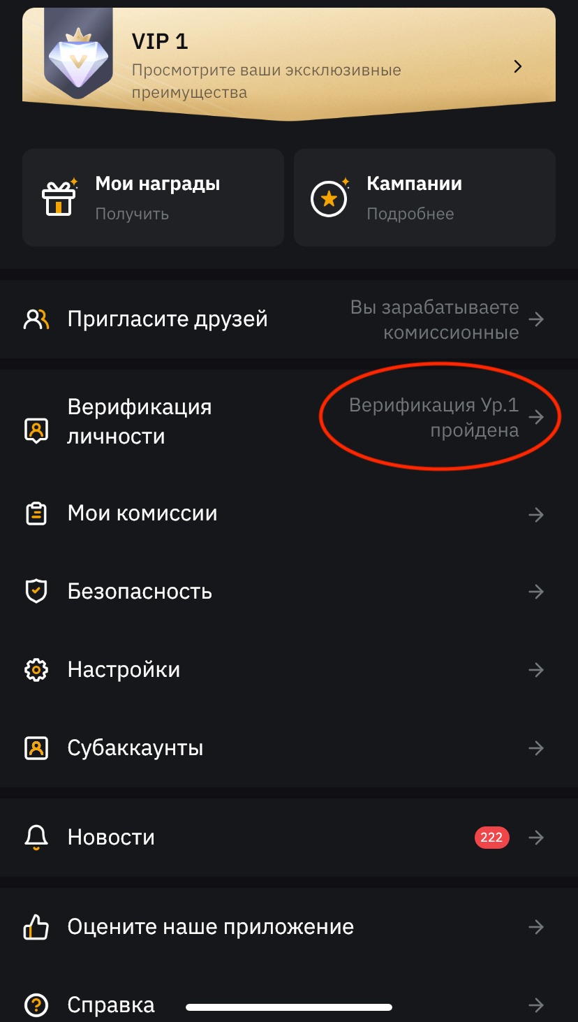 Зарегистрируйтесь на бирже и пройдите верификацию личности (достаточно 1 уровня)