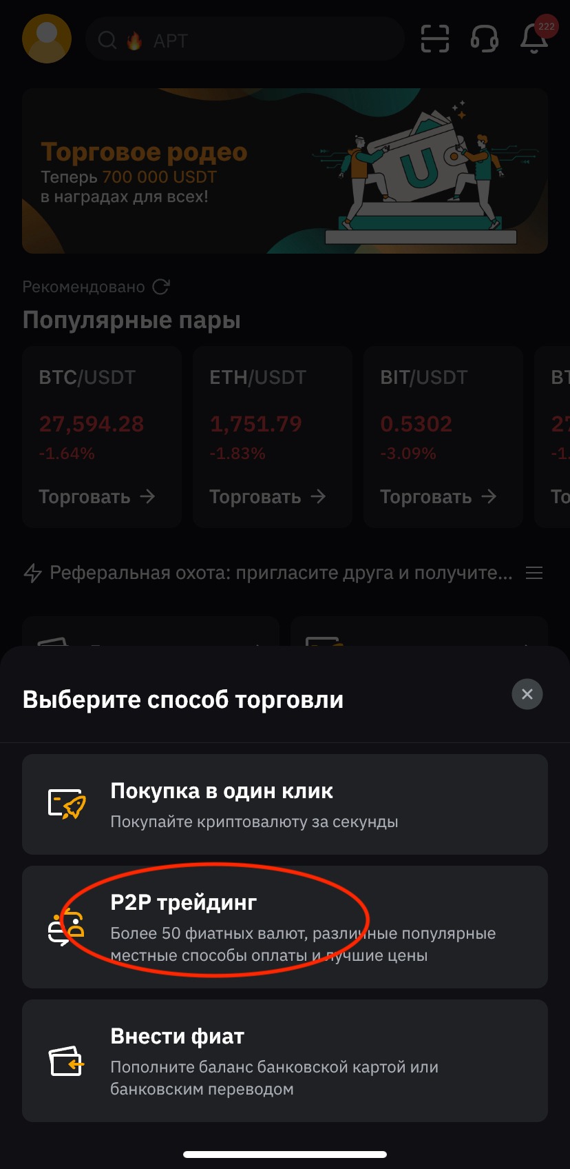 После верификации на главном экране нажмите кнопку "Купить криптовалюту” выбрав способ "P2P трейдинг"