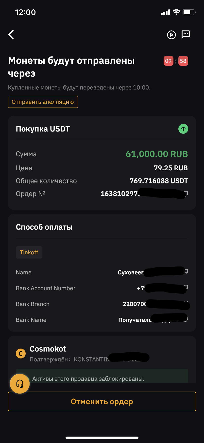 Ждите прихода криптовалюты. Обычно это занимает до 10 минут. В случае если не получите средства в течении 15 минут, нажмите сверху слева на кнопку "Отправить апелляцию"