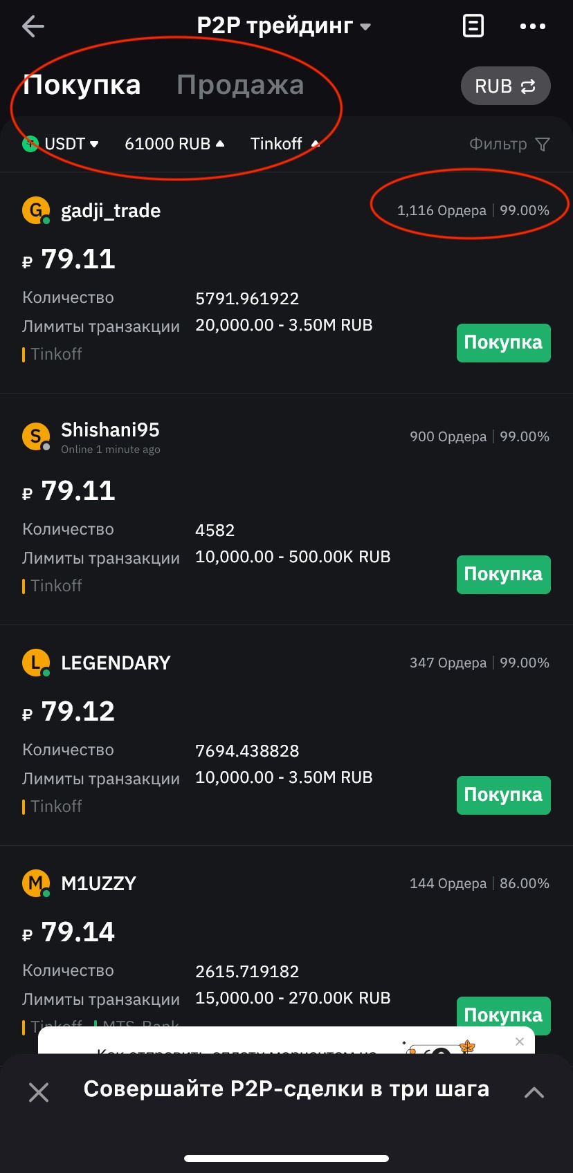 Из имеющихся предложений выберите то, которое вам подходит. Мы рекомендуем обращать внимание на количество ордеров и процент выполненных (чем больше количество и процент, тем лучше).