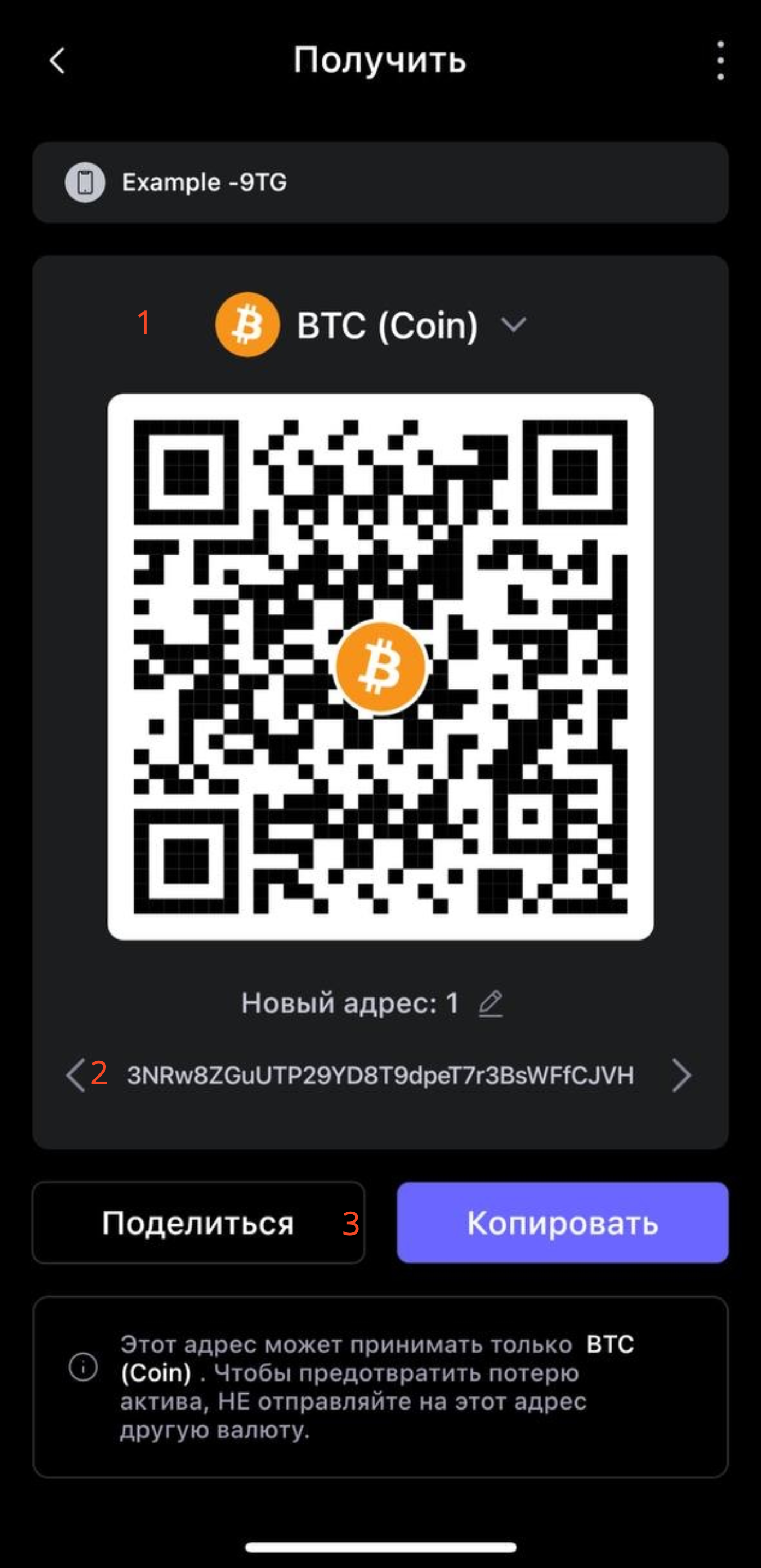 Вы можете (3) поделиться или копировать его и вставить на веб сайте или дать кому либо, чтобы он мог перевести вам Bitcoin