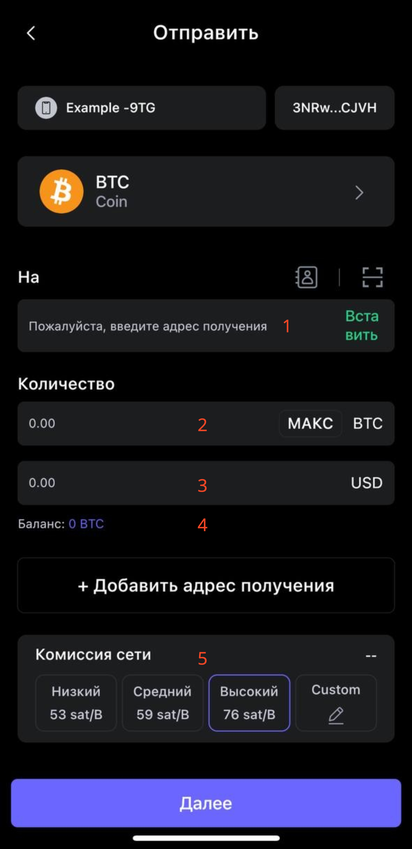 Лучше выбирать «Средний» или «Высокий» чтобы Bitcoin быстрее пришел адресату