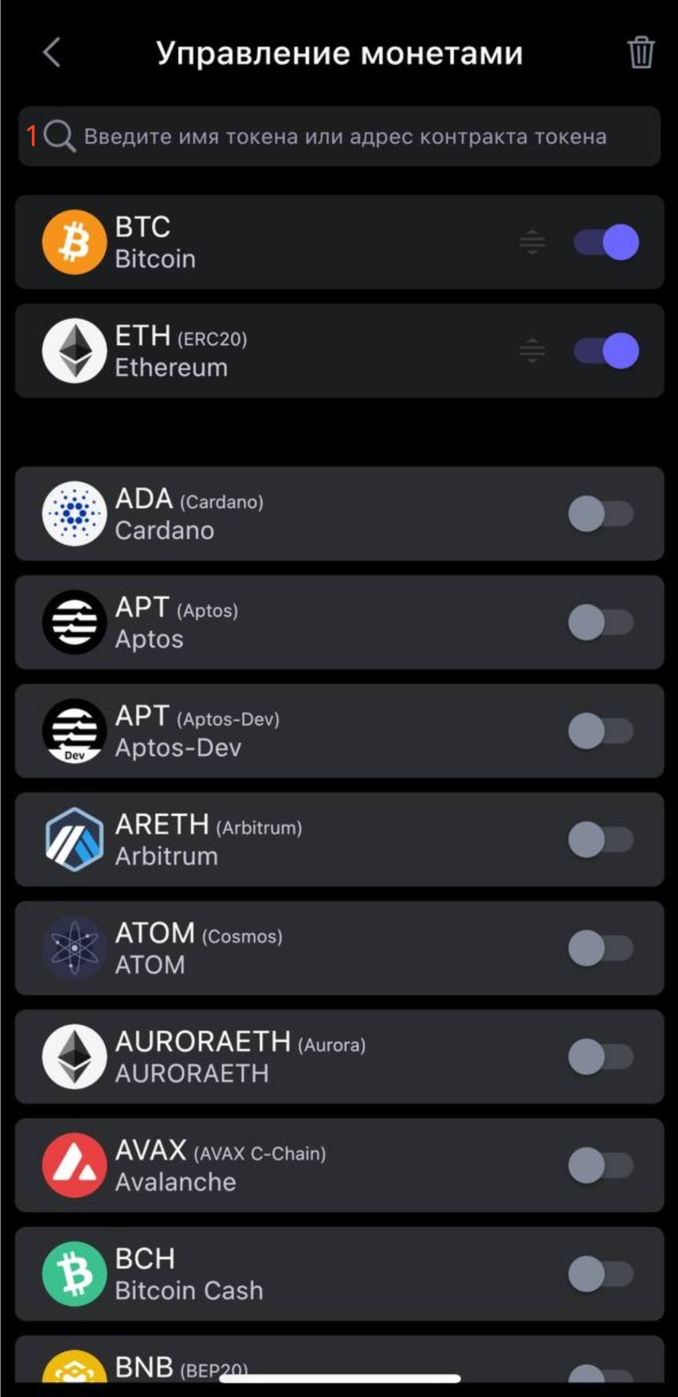 (3) Нажмите чтобы добавить или убрать другие криптовалюты