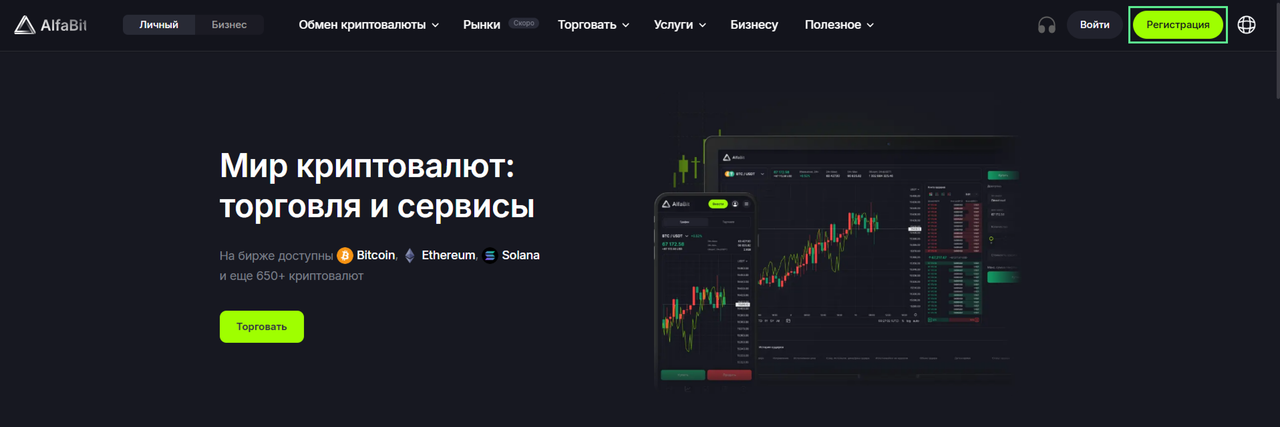 - Перейдите на сайт AlfaBit. Нажмите Регистрация.