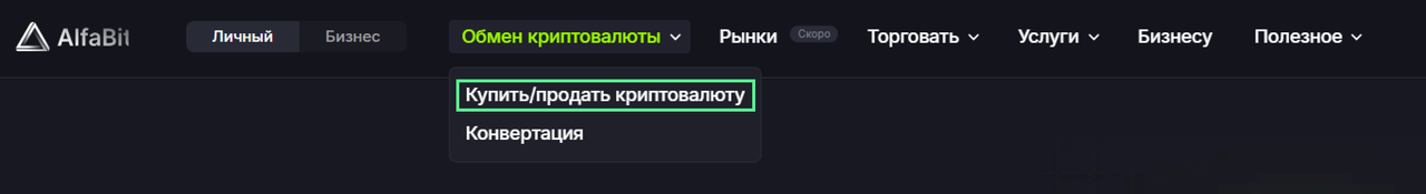 - В меню выберите Обмен криптовалюты → Конвертация.