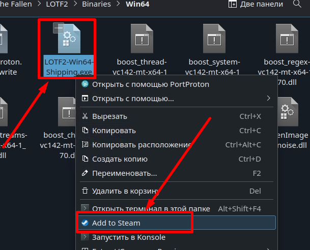 - ВАЖНО! Если в инструкции указано добавление ярлыка exe файла через контекстное меню по нажатию по файлу L2 - и выбора из списка Add to Steam, то нужно выполнить именно данные действия, ярлык добавленный в Steam через PortProton не тоже самое и механизм работы совершенно другой!