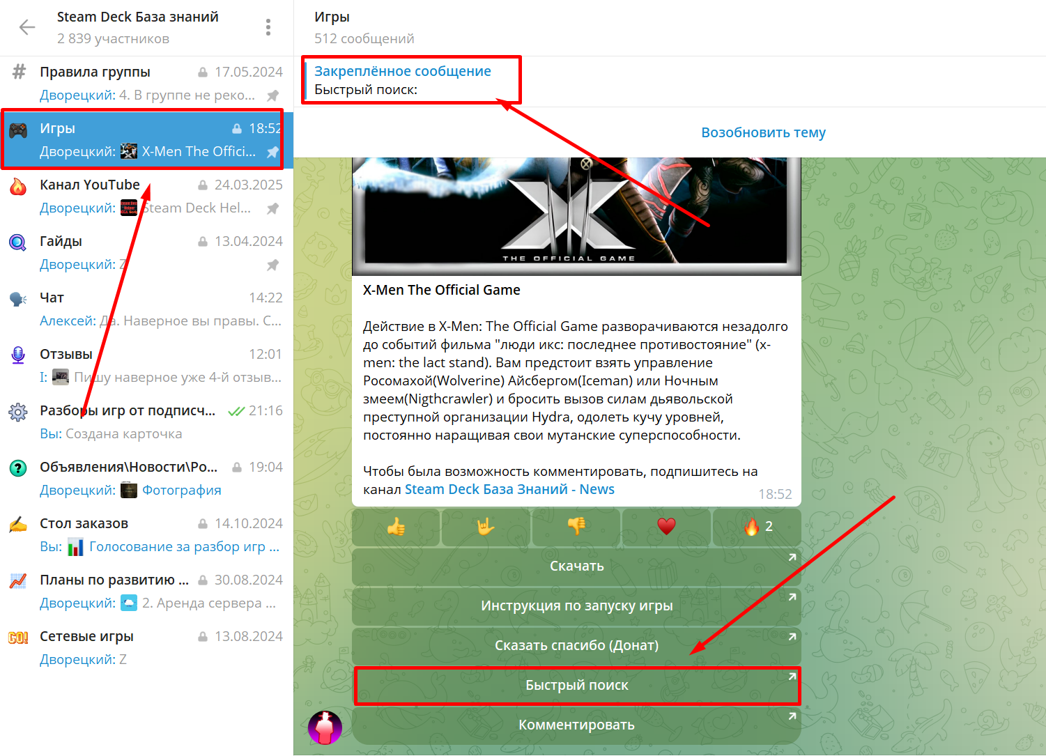 В группе Steam Deck База Знаний реализован удобный Быстрый поиск по карточкам игр в теме ИГРЫ. Добавленно закрепленное сообщение и кнопка Быстрый поиск в карточках игр.