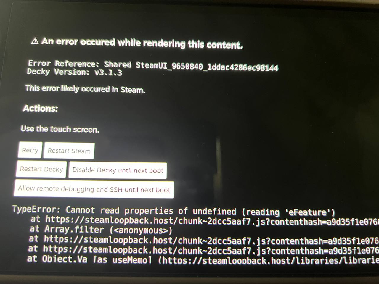 Ошибка после загрузки Steam Deck или при его работе An error occured while rendering this content