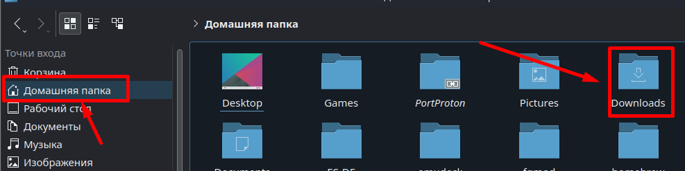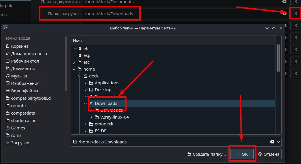 - Создаем каталог Downloads в Домашней папке (/home/deck/)