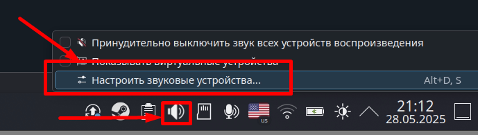- Переходим в настройки звука, для этого в Рабочем режиме нажимаем L2 по значку динамика в правом нижнем углу и выбираем Настроить звуковые устройства.