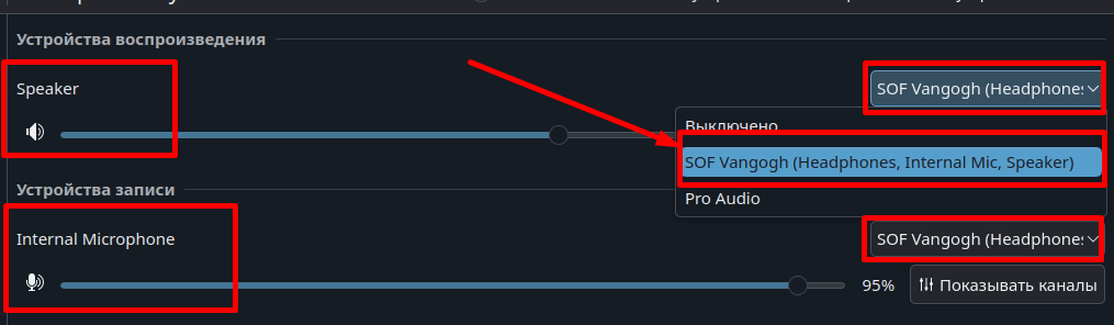 - В появившемся окне убеждаемся что у Speaker и Internal Microphone выбран верный профиль: SOF Vangoug, а не Pro Audio.