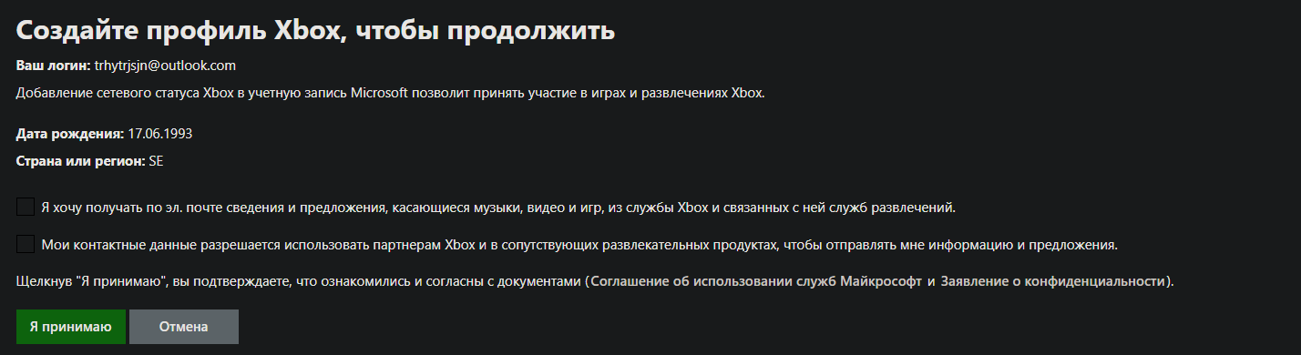 #7. После регистрации создаем профиль XBOX Live, нажмите "Я принимаю".