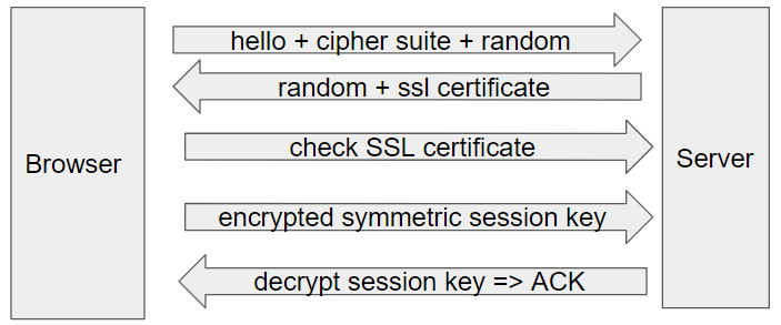 - Клиент (или браузер) хочет получить доступ к веб сайту (серверу) по защищенному каналу. Поэтому клиент посылает HelloRequest. Туда он включает набор алгоритмов шифрования, которые он поддерживает и рандомное значение.