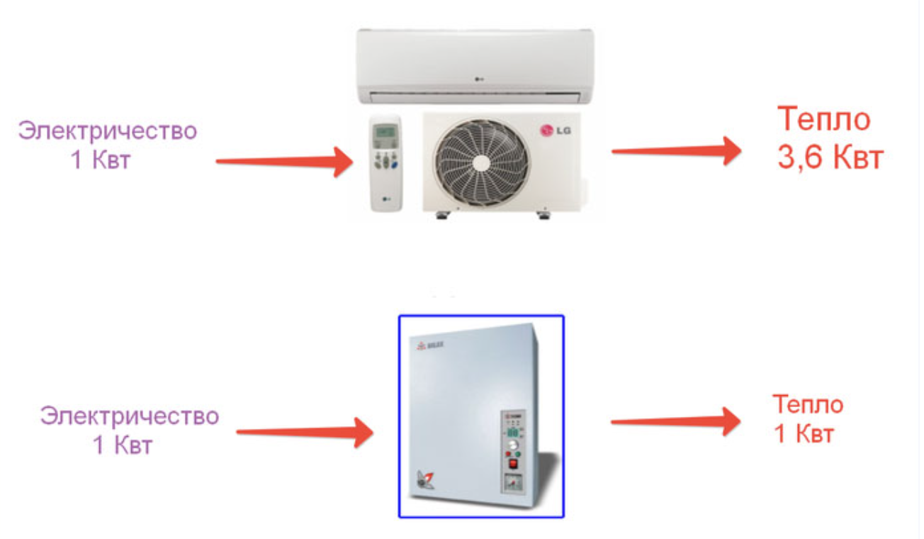 Главное преимущество этой схемы заключается в том, что на работу компрессора затрачивается гораздо меньше эл.энергии, чем на выработку соответствующего количества тепла, которое кондиционер способен перекачать между двумя теплообменниками.