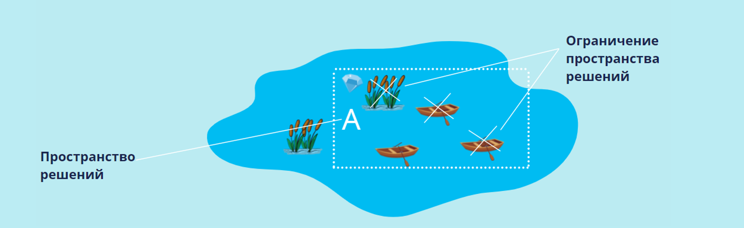 Рассмотрим на простом примере. Клиент хочет найти клад на дне озера. Он знает примерное место, где могут лежать сокровища, и обводит его на карте пунктиром. Так что исследовать все озеро вам не нужно. Пространство решения в этом случае – зона А. Вы анализируете ситуацию и понимаете, что справитесь за один день, если возьмете три катера с людьми. Клиент против такого решения. В озере он разводит редких рыб, шум моторов их напугает. С количеством задействованных лиц клиент тоже не согласен. Три катера привлекут внимание зевак, потому лучше оставить один. Кроме того, в зоне А есть мели. Чтобы лодка не села на них, надо следить за глубиной воды. Вы столкнулись с ограничениями пространства решений: нельзя использовать моторные лодки, можно взять только одно судно и нужно избегать мелей.
