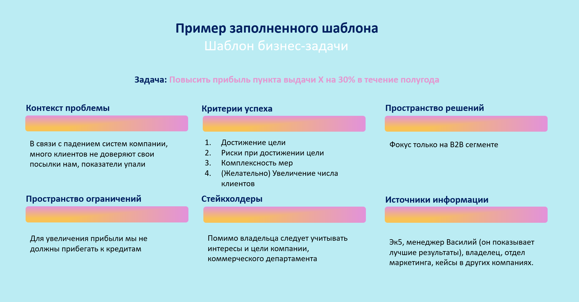 Ниже очень обзорный пример заполненного шаблона. Естественно, чем подробнее подойдете к заполнению шаблона по своей задаче, тем эффективнее будет для дальнейших шагов в ее решении.