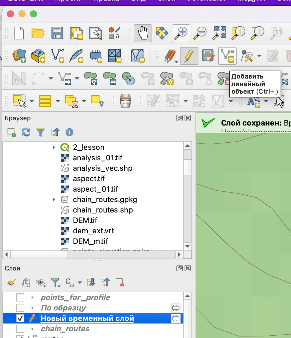 3) Добавляем новый слой в список слоев и включаем режим редактирования. Выбираем инструмент добавления новой линии (полигона) - add line/polygon feature.