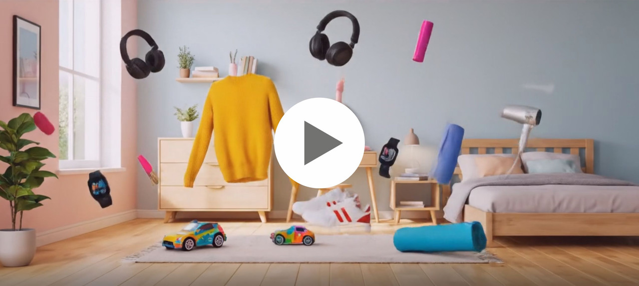 A hyper-realistic cinematic video of a bright, empty living room with soft pastel walls, light wooden floor, and a window on the left streaming in gentle daylight. In the center of the floor sits a large glossy cardboard box in Wildberries' signature deep magenta (#9D00BF) color, with the bold white Wildberries logo (uppercase sans-serif) clearly visible and centered toward the camera. The box gleams under natural light. The camera stays fixed in a wide-angle position. Suddenly, the box begins to shake slightly, then bursts open. A colorful stream of items erupts: fashion pieces, sneakers, headphones, beauty products, children’s toys, a smart watch, a yoga mat, a hairdryer. Each item lands in its place as if guided by invisible hands: folded in drawers, placed on a vanity, hung on wall hooks. The scene transforms into a vibrant, cozy room full of energy, representing lifestyle variety. Final shot shows the fully styled living space — neat, joyful, and full of personality. No text.
