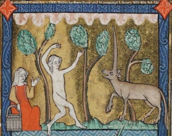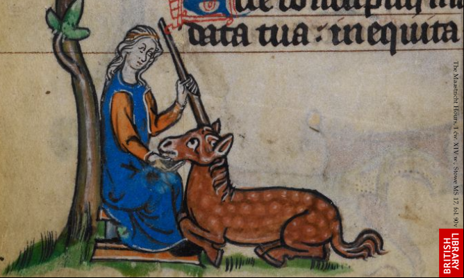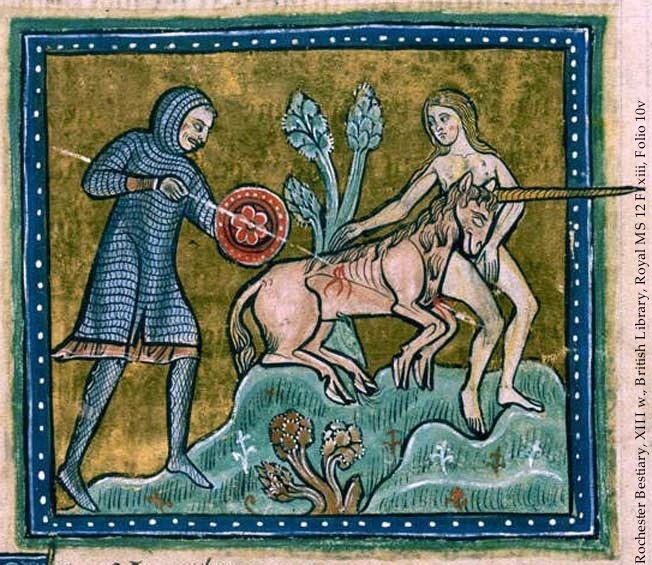 Единорог-мифическое животное, относительно часто встречающееся в средневековом искусстве. Он должен был быть чистым существом, символизирующим Христа. Чаще всего его изображали как лошадь (возможно, осла или козла) с одним рогом на голове.