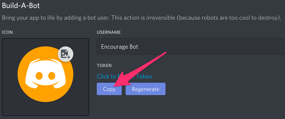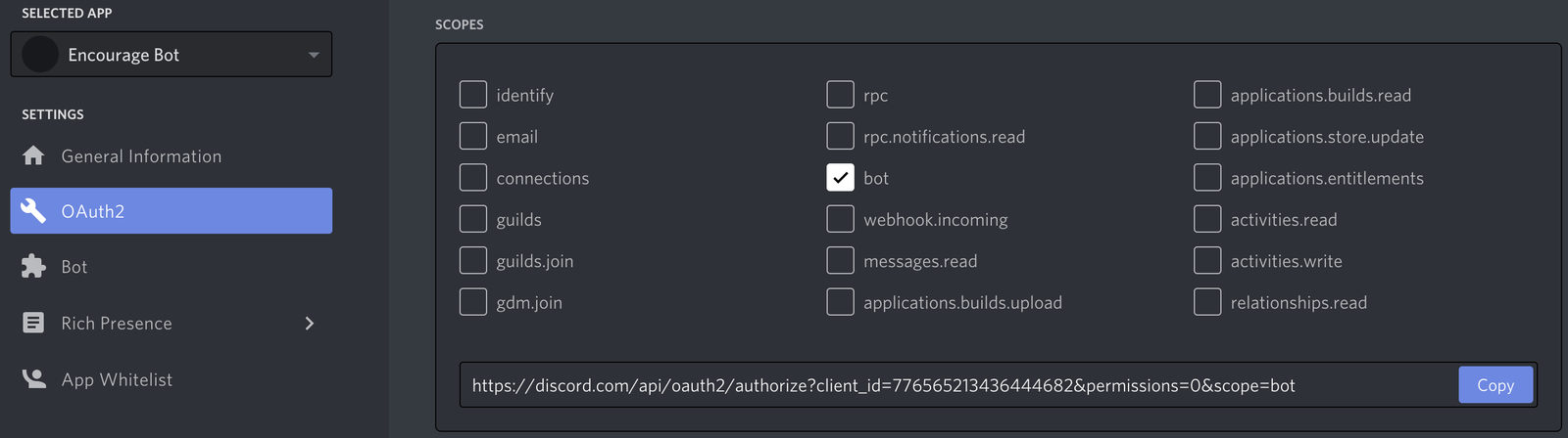 После выбора соответствующих разрешений нажмите кнопку «Copy» над разрешениями. Это скопирует URL-адрес, который можно использовать для добавления бота на сервер.
