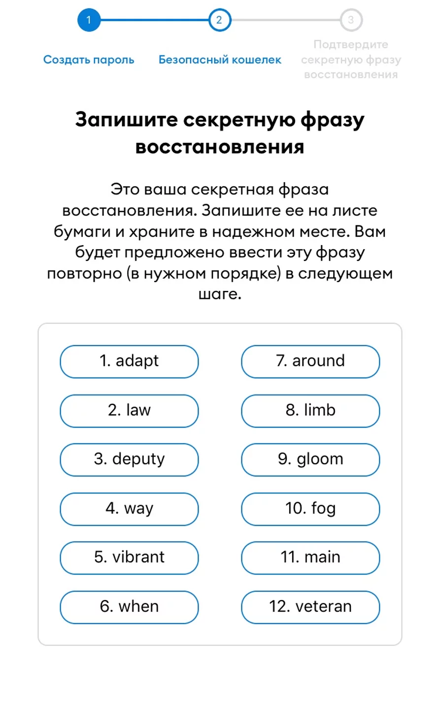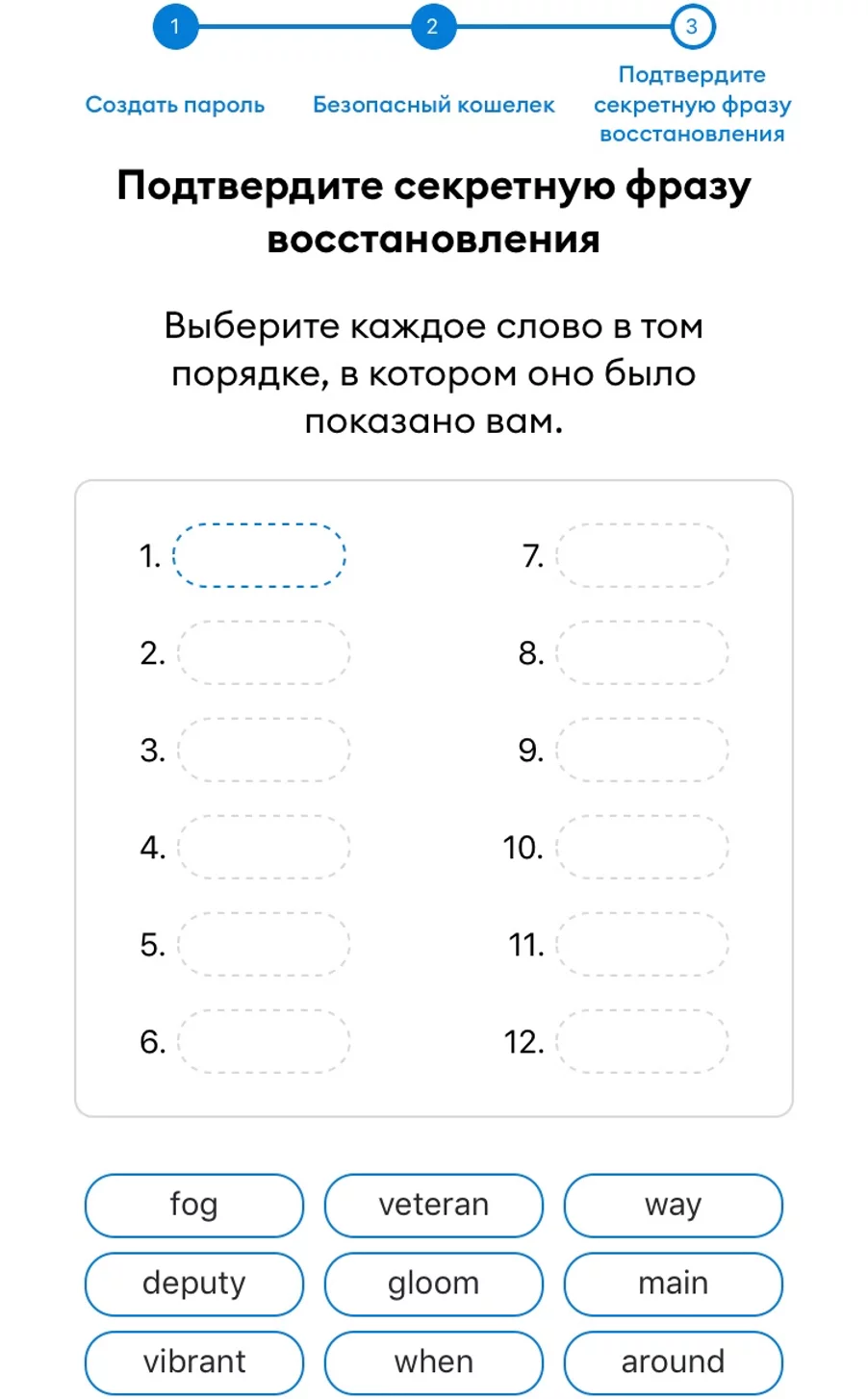 В заключение ввести seed-фразу. Внимание: нельзя переставлять слова местами! Если все шаги были выполнены последовательно и верно, то пользователь получает доступ к кошельку.
