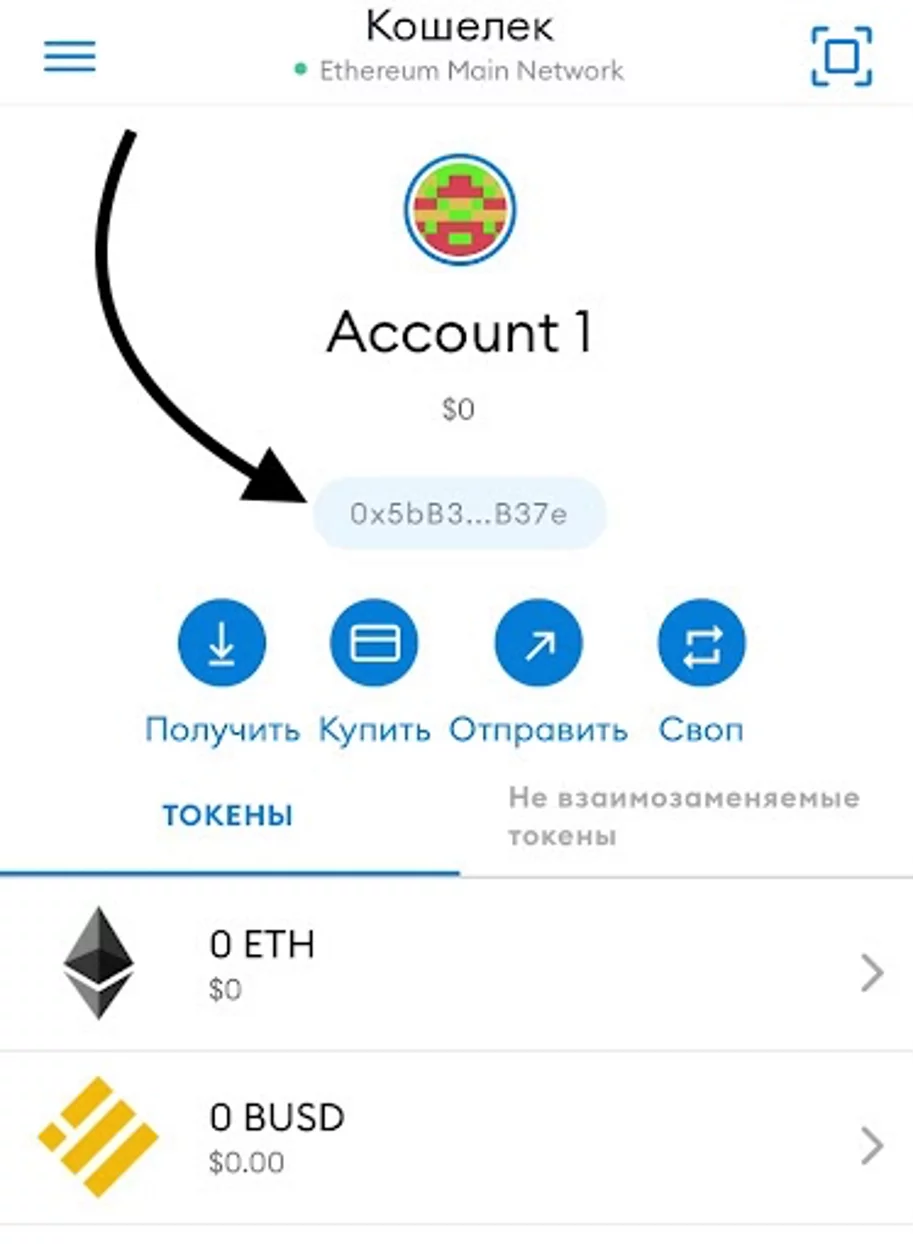 На главной странице выведен длинный номер — это и есть номер криптокошелька MetaMask.
