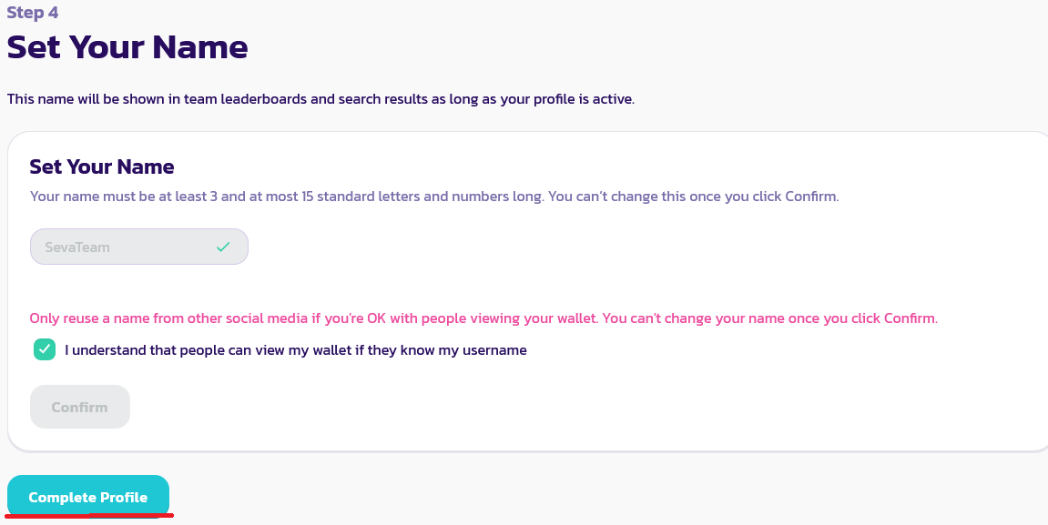 7. Остается придумать себе никнейм, нажать на галочку, на кнопку "confirm" и подписать сообщение, которое выйдет на Metamask.