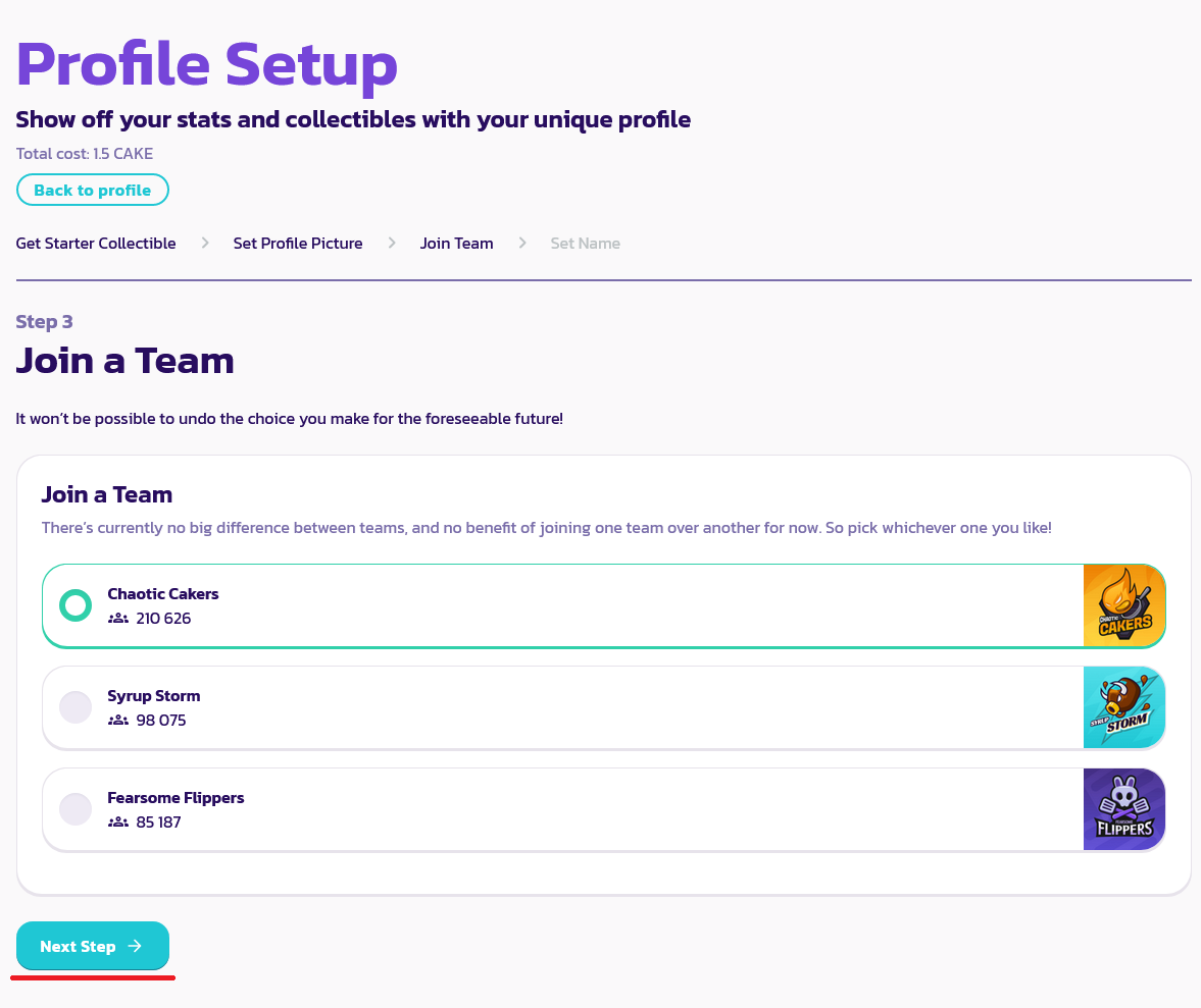 6. Здесь следует выбрать команду, в которую мы желаем вступить. Я выбрал Chaotic Cakers. Затем кликаем на "Next Step".
